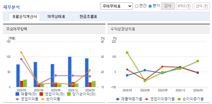 -2024년 3월 전년동기 대비 연결기준 매출액은 25.7% 증가, 영업이익은 24.5% 감소, 당기순이익은 9.6% 감소. 동사가 추진하고 있는 IT 교육 사업의 축소 탓에 IT 교육 매출은 꾸준히 감소하여 매출 하락의 주요 원인임. 현재 의대 정원 확대로 정부와 의료계가 강대강 대립을 이어가고 있는 가운데, EMR과 연동 가능한 비대면 진료 플랫폼을 가지고 있는 동사의 차별화된 경쟁력이 성과를 낼 수 있을 것으로 기대됨.