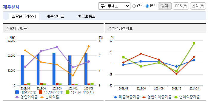 -2024년 3월 전년동기 대비 연결기준 매출액은 5.4% 증가, 영업이익은 11.2% 증가, 당기순이익은 7.5% 증가. 건설 분야에서는 전분기 일회성 비용 반영 기저효과와 국내외 프로젝트의 수행 안정성유지되며 전분기 대비 실적 개선되었음. 상사 부문에서는 철강 물량 확대, 비료/구리 고마진 트레이딩 증가 및 미 태양광 매각 수익영향 등으로 전분기 대비 영업이익 증가하였음.