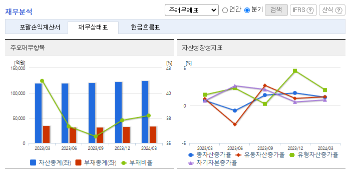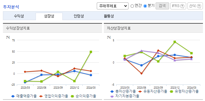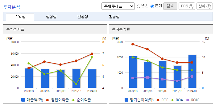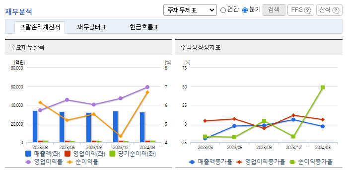 -2024년 3월 전년동기 대비 연결기준 매출액은 4.5% 감소, 영업이익은 16.2% 증가, 당기순이익은 4.2% 증가. 사업부문별로 보면 IT서비스 매출이 5.7% 성장했으나, 물류 사업은 글로벌 운임 하락과 물동량 감소로 12% 감소했음. 신성장동력인 클라우드 사업은 29% 증가한 5308억 원을 기록했고, 디지털 물류 플랫폼 '첼로스퀘어' 매출은 2550억 원을 기록하며 381% 성장하며 앞으로의 성장이 기대됨.