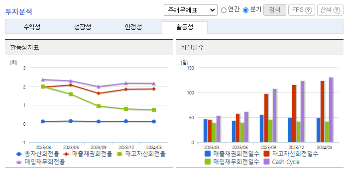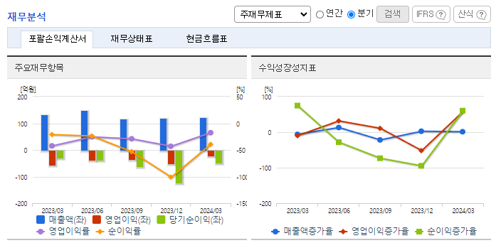 -2023년 12월 전년동기 대비 별도기준 매출액은 0.2% 증가, 영업손실은 29.2% 증가, 당기순손실은 36.2% 감소. 신규사업 진출을 위한 라이선스인 계약의 선급금 지급으로 유동자산 중 현금성 자산이 감소했으나, 지분증권과 채무증권의 취득 등으로 비유동자산은 증가함. 영업손실은 외주영업 등에 소유되는 수수료와 경상 연구개발비 등으로 판관비가 발생해 오히려 악화했음.