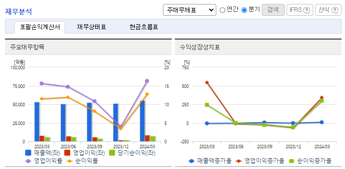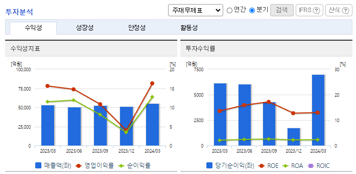 -2024년 3월 전년동기 대비 연결기준 매출액은 3.1% 증가, 영업이익은 7.6% 증가, 당기순이익은 14.4% 증가. 장기보험 및 자동차보험 등 양호한 보험손익과 와 투자 평가손익 증가로 컨센서스 상회. CSM판매량 증가세. 주주환원정책의 구체화가 시작되었고, 압도적으로 높은 K-ICS비율 및 적은 해약환급금준비금 규모(자본대비 9%) 고려 시, 주주환원을 기대할 여력은 충분함.
