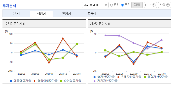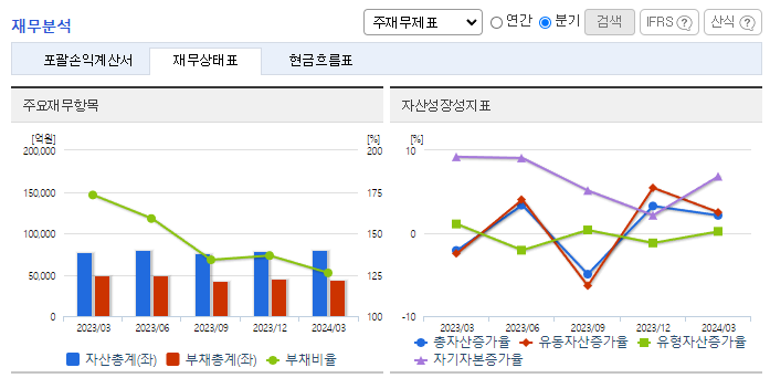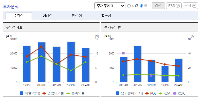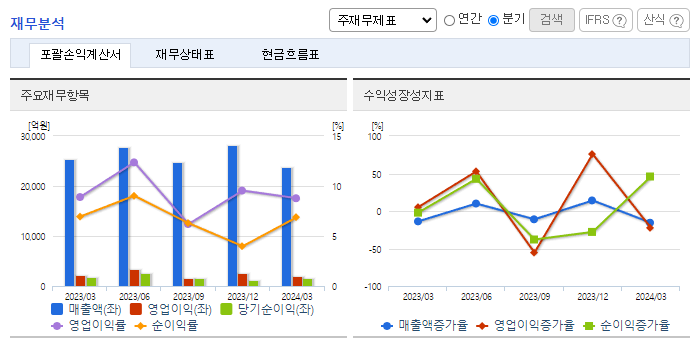 -2024년 3월 전년동기 대비 연결기준 매출액은 5.9% 감소, 영업이익은 7.1% 감소, 당기순이익은 8.7% 감소. 불확실한 대외 환경에도 동사는 프로젝트 손익관리와 모듈화, 자동화 등 혁신 적용을 통한 원가개선을 위해 노력하였음. 원가율 개선으로 수익성은 유지 중이지만 신규 수주 감소로 실적이 소폭 감소함. 특히 정유 공장, 가스 생산 및 석유화학 플랜트 등을 건설하는 화공부문 수주잔고가 감소함.