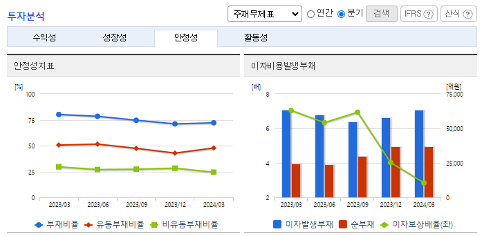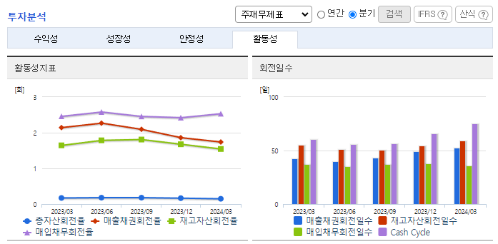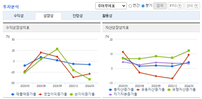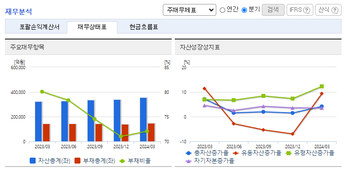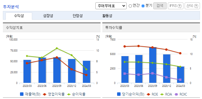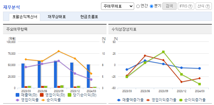 -2024년 3월 전년동기 대비 연결기준 매출액은 4.2% 감소, 영업이익은 41.2% 감소, 당기순이익은 37.8% 감소. 에너지솔루션 부문의 실적 감소와 연구개발비와 지급수수료와 같은 판매비와 관리비의 증가 및 인건비의 증가로 영업이익 또한 감소함. OLED용 소재 판매 확대와 편광필름 제조 경쟁력 확보 등 어려움 속에서도 미래 성장을 위한 기반을 마련함.