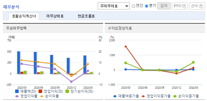 -2023년 12월 전년동기 대비 연결기준 매출액은 22.2% 감소, 영업이익은 60.3% 감소, 당기순이익은 26.3% 감소. 콘덴서 제품 매출이 내수 시장과 수출 시장 전반에서 부진하며 전체 외형이 쪼그라듬. 판관비와 인건비 등 비용 절감 노력에도 불구하고 영업이익이 크게 감 2024년 매출목표는 매출목표는 1,900억 원 이상으로 정함. 신설비의 도입을 통하여 고부가가치의 신제품을 지속적으로 개발하는 중.
