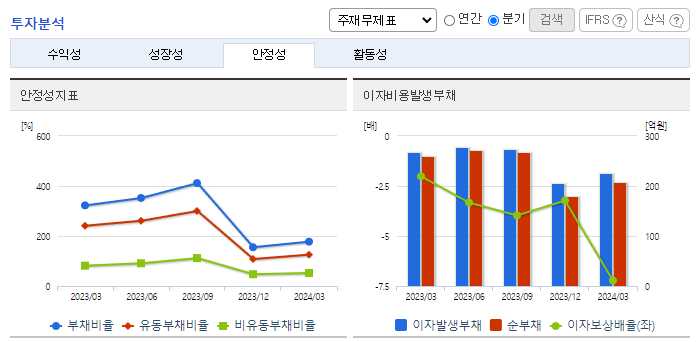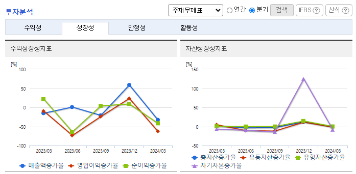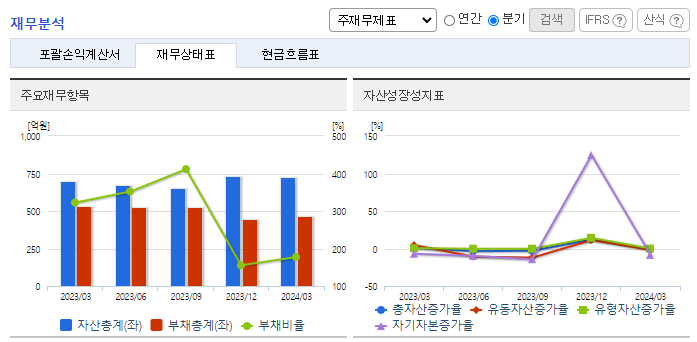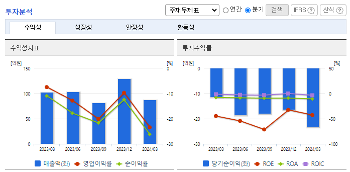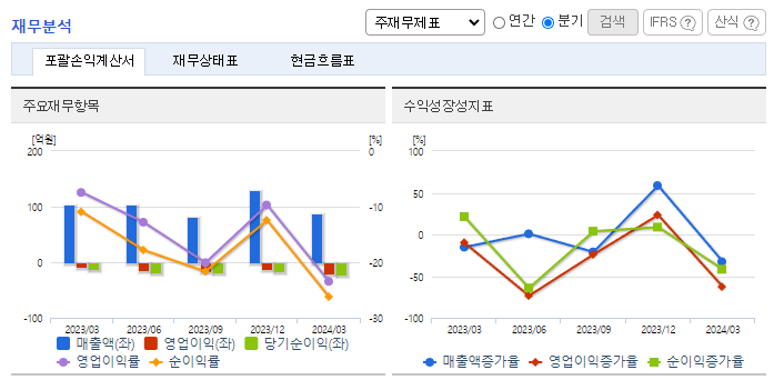 -2024년 3월 전년동기 대비 연결기준 매출액은 14.9% 감소, 영업손실은 168.6% 증가, 당기순손실은 122.6% 증가. 생활(주방) 가전용 EMI/EMC 제품에서 신규개발 광대역 주파수 필터 및 하이브리드 필터 개발을 완료하여 양산 체계를 갖추었음. 중국으로의 수출 수익은 전년동기 대비 소폭 증가했지만, 내수 매출이 다소 감소하였고 지급수수료 등과 같은 판관비와 인건비용이 증가하여 영업손실폭이 증가함.