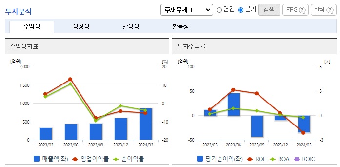 -2024년 1분기 연결기준 영업이익 전년동기 대비 적자전환, 당기순이익 적자전환함. IB, 리테일, 자산운용 등 모든 부문의 이익 감소와 적자 기록으로 영업이익과 당기순이익 모두 적자전환함. 인건비와 전산비 등 판관비도 크게 늘어남. 유가증권 운용내역을 보면 주식에서는 101.5억 원, 채권에서는 117.5억 원의 이익이 발생함. 당분기말 현재 순자본비율은 219.02%로 전년말 대비 12.02%p 개선됨.