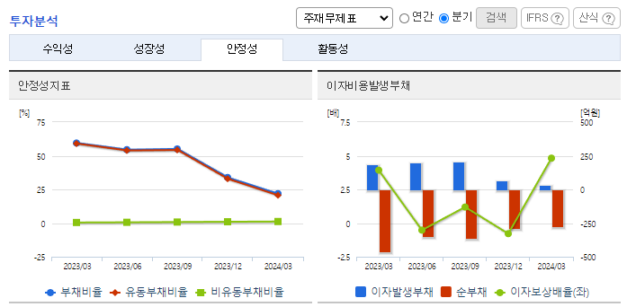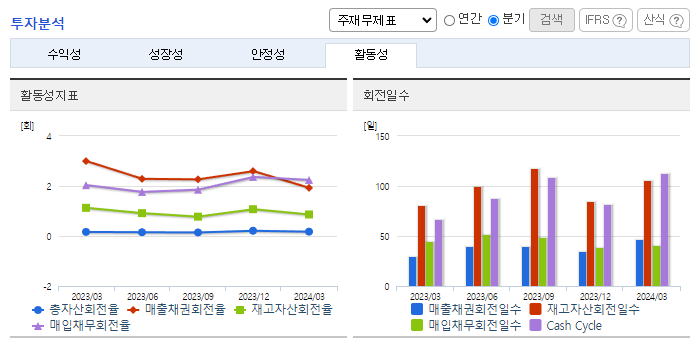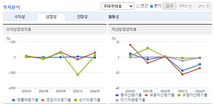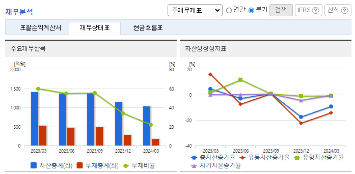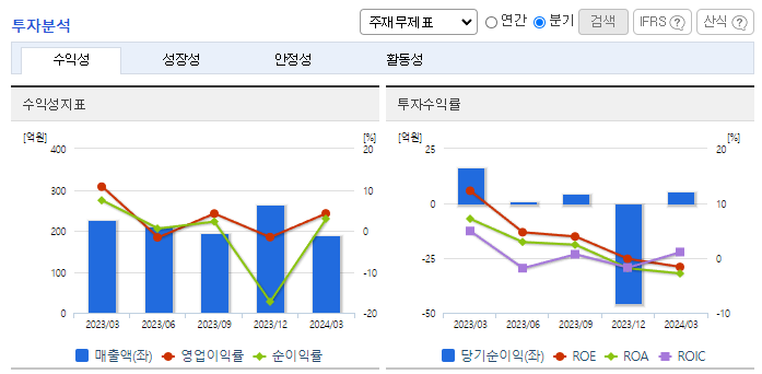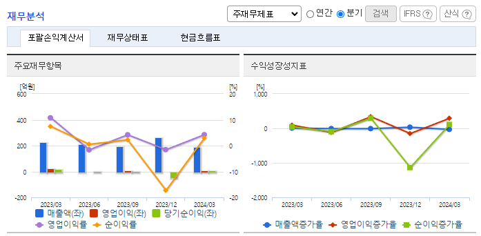 -2024년 3월 전년동기 대비 연결기준 매출액은 16.6% 감소, 영업이익은 67.1% 감소, 당기순이익은 68.7% 감소. 주요 매출인 상품(시약, 소모품, 기기) 매출의 감소에도 불구하고 비용 절감 노력으로 영업이익은 흑자전환에 성공함. 주요 사업 부문인 바이오 토탈 솔루션 사업은 2024년 알츠하이머 항체 치료제, 비만, 당뇨 치료제 등 성장에 힘입어 업황 개선을 기대.