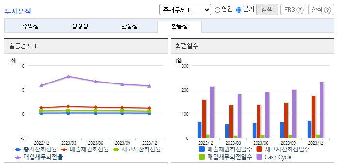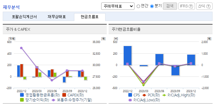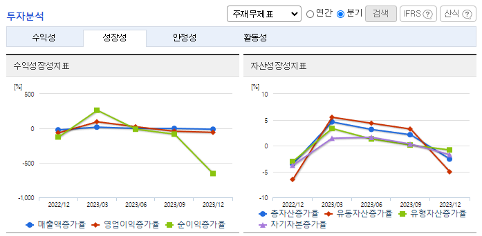 -2023년 12월 전년동기 대비 연결기준 매출액은 6.4% 감소, 영업이익은 30.6% 감소, 당기순이익은 82% 감소. 매출 역성장과 더불어 원가율이 크게 오르면서 매출이익률이 악화됨. 특히 판매관리비를 크게 줄였음에도 영업이익은 30.6% 감소함. 전체 매출비중 40% 이상 차지하던 건강기능식품의 매출이 2년 연속 역성장하며 32% 수준으로 감소함. 하드캡슐 부분은 꾸준히 성장 중.