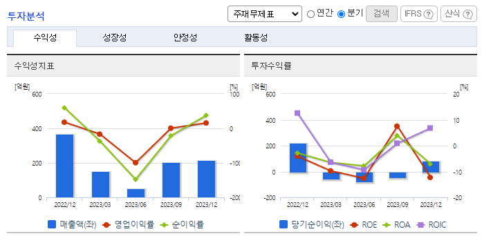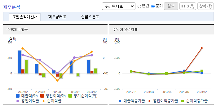 -2023년 12월 전년동기 대비 연결기준 매출액은 15.7% 감소, 영업이익 적자전환, 당기순손실은 185.3% 증가. 매출은 전년 대비 줄었고 판매비와 관리비는 늘었음. 인건비 역시 늘면서 수익성 자체는 악화했고, 결국 적자 전환했음. 동사의 특허기술인 새로운 하이브리드형 RGB 증착기 공법을 적용하여 혁신적 마스크 제작 공법, 물류 방식 등을 개발할 예정임.