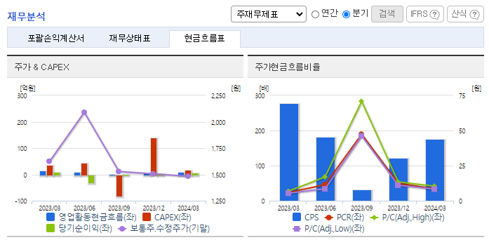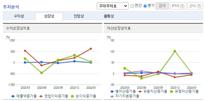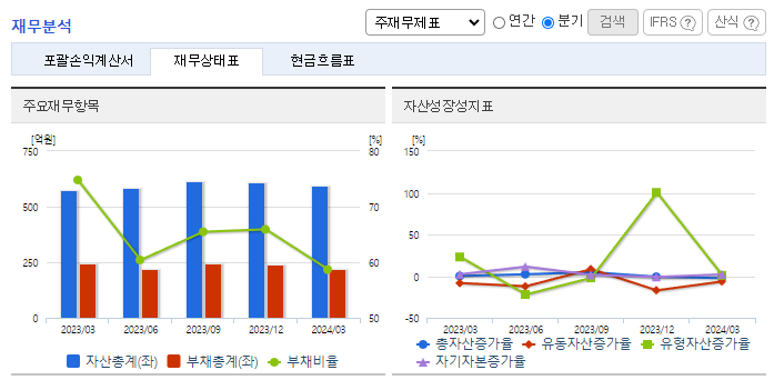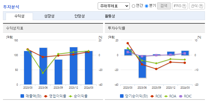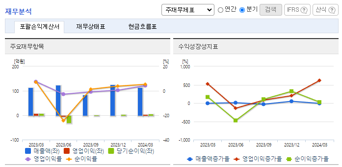 -2024년 3월 전년동기 대비 연결기준 매출액은 0.1% 감소, 영업이익은 42.3% 감소, 당기순이익은 24.3% 감소. 매출액은 전년동기 대비 미미하게 감소하였지만 급여, 운반비 등의 판매비와 관리비, 인건비 비용이 증가하면서 영업이익이 약 42% 감소하였음. 2024년은 원재료 가격상승으로 인한 제조원가 상승이 예상되고 있으며, 내부의 원가절감에 노력하고 있음.
