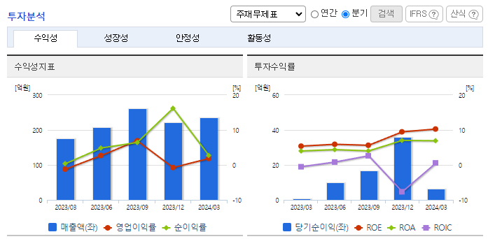 -2023년 12월 전년동기 대비 별도기준 매출액은 1% 감소, 영업이익은 11.5% 감소, 당기순이익은 65.9% 증가. 생산시설 확보를 위해 약 315억원을 구미공장 신규 시설투자에 투자할 계획이며, 공사 및 설비 도입 종료일은 2024년 내로 예정되어 있음. 대기업과 독점적인 공급 우위에 있는 아이템을 지속 개발, 보유함으로써 안정적인 매출 확보를 유지하고 있음.