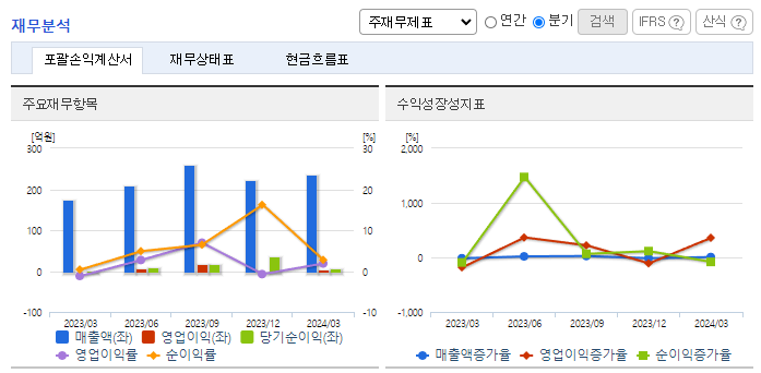 -2023년 12월 전년동기 대비 별도기준 매출액은 1% 감소, 영업이익은 11.5% 감소, 당기순이익은 65.9% 증가. 생산시설 확보를 위해 약 315억원을 구미공장 신규 시설투자에 투자할 계획이며, 공사 및 설비 도입 종료일은 2024년 내로 예정되어 있음. 대기업과 독점적인 공급 우위에 있는 아이템을 지속 개발, 보유함으로써 안정적인 매출 확보를 유지하고 있음.