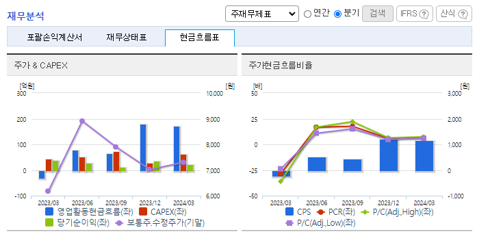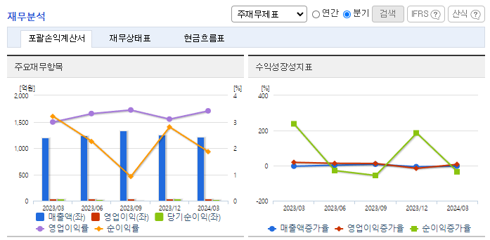 -2024년 3월 전년동기 대비 연결기준 매출액은 1.1% 증가, 영업이익은 15.5% 증가, 당기순이익은 41.5% 감소. 고객사의 수주 물량 감소에 따라 매출이 감소하였으나, 헤드램프 매출액이 크게 상승하며 실적 성장을 견인함 전기차 업황 둔화에 따라 전장카메라 및 렌즈의 수요 감소 그리고 스타프노의 교체 주기 증가에 따른 모바일 렌즈 매출이 감소하였으나 헤드램프 매출이 실적을 뒷받침해주고 있음