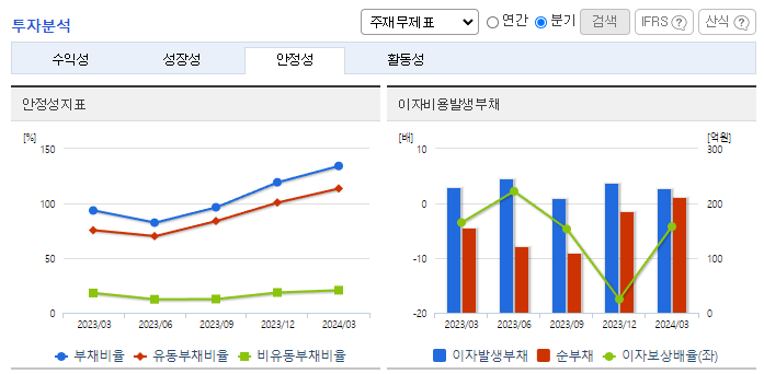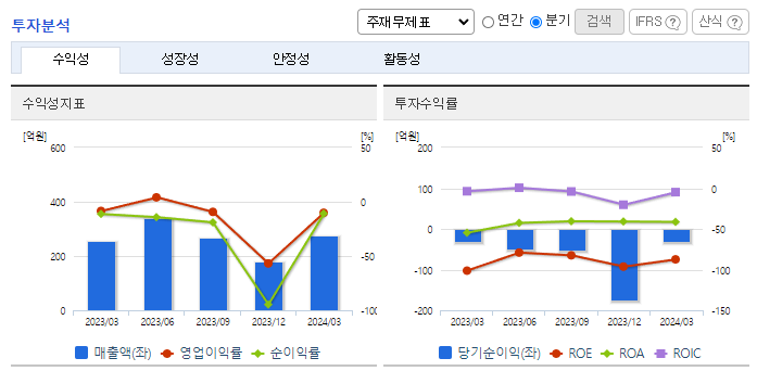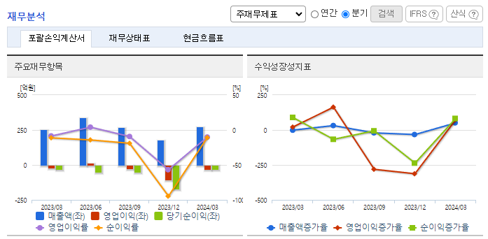 -2024년 3월 전년동기 대비 연결기준 매출액은 9.8% 증가, 영업손실은 55.1% 증가, 당기순손실은 2.8% 증가. 매출원가 11.0%, 판관비 26.3% 증가하면서 영업이익에 악영향을 줌. 동사는 STS 316/430/201 강종을 Coil, Skelp, Sheet 형태로 판매하고 있으며, 이 중에서도 STS 201은 주력 제품으로 국내 시장점유율 약 30~40%를 차지하여 1위를 점유하고 있음.