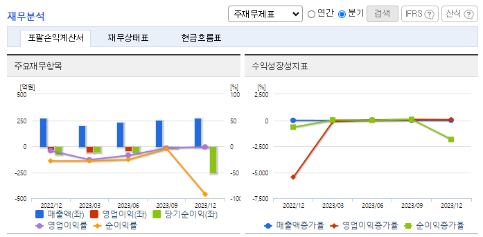 -2023년 12월 전년동기 대비 연결기준 매출액은 21.7% 감소, 영업손실은 283.4% 증가, 당기순손실은 569.5% 증가. mRNA 백신 생산 효소 사업은 독일과 위탁개발을 진행 중. 개발완료 후 해외 위탁 생산을 통해 유럽/아시아/북미권 시장 진입을 목표로 함. 또한 2차 전지/전기이륜차 사업을 추진하고 있으며, 해외의 유력 제조사와 개발 및 생산을 공동으로 진행하여 추후 국내에서 자체 생산 및 판매를 목표로 하고 있음.