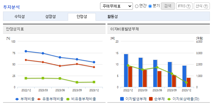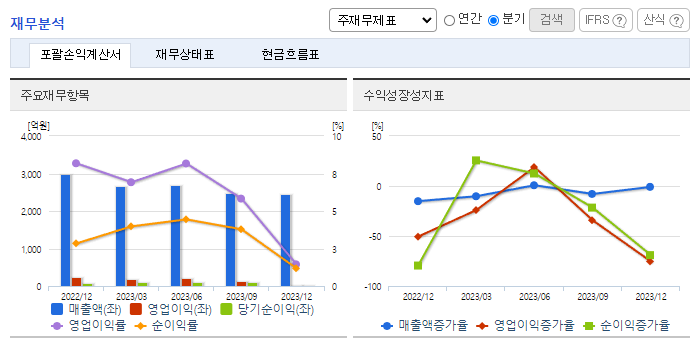 -2023년 9월 전년동기 대비 연결기준 매출액은 24% 감소, 영업이익은 65.8% 감소, 당기순이익은 74.1% 감소. 불안정한 글로벌 환경하에서 수요감소함에 따라 산업용 및 기능성 화학제품의 수출 부진한 모습. 매출 감소에 따른 원가율 상승 여파로 수익성은 보더 큰 폭으로 하락한 상황. 불확실성이 계속되고 있어 단기간 내 급격한 실적개선은 쉽지 않을 전망이나 고객사의 재고 수준 확대 시 개선 가능할 것으로 기대.