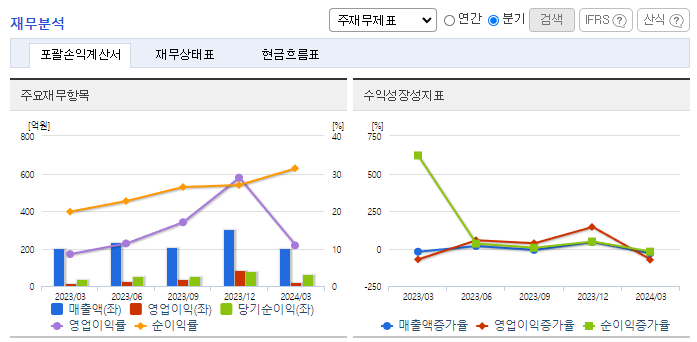 -2023년 12월 전년동기 대비 연결기준 매출액은 5.9% 증가, 영업이익은 6.7% 감소, 당기순이익은 28.5% 증가. 통합보안시스템 사업은 경기침체에 따라 해외와 국내 사업이 지연되었으나 AI기반 3세대 얼굴인식제품 바이오스테이션3가 뜨거운 시장 반응을 보이며 성장을 견인함. 국내 최초 클라우드 출입인증 매니지드 서비스 ‘CLUe’를 출시하여 일본지역 매출의 가파른 성장을 이룸.