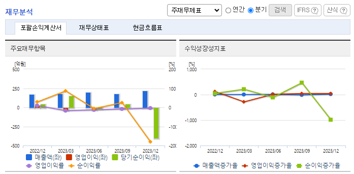 -2023년 12월 전년동기 대비 별도기준 매출액은 27.4% 증가, 영업이익 적자전환, 당기순이익 적자전환. 매출액 증가 배경은 CSO 사업부의 활성화 및 항생제 등 기존 주력 제품의 시장 매출 확대를 통한 매출액 개선으로 파악됨. 23년 8월 고지혈증 치료제인 아도르정40밀리그램을 발매 하였으며, 9월 소화기용제인 란소멜캡슐15밀리그램, 란소멜캡슐30밀리그램을 발매 하였음.