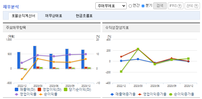 -2023년 12월 전년동기 대비 연결기준 매출액은 7.1% 증가, 영업이익은 88% 증가, 당기순이익은 72.5% 증가. 대부분의 매출비중을 차지하는 연성회로기판(FPCB) 등 핸드폰 부품 사업으로 호조로 필터 사업 부진에도 견조한 외형 성장을 이뤘고, 손익도 개선됨. 기존시설을 활용하여 친환경 자동차에 필요한 각종 필터와 멤브레인을 제조하고 있으며, 최근에는 그 성능을 인정받아 해외기업과의 납품계약을 추진 중임.