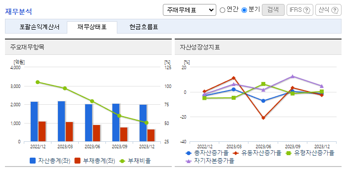 -2023년 12월 전년동기 대비 연결기준 매출액은 7.1% 증가, 영업이익은 88% 증가, 당기순이익은 72.5% 증가. 대부분의 매출비중을 차지하는 연성회로기판(FPCB) 등 핸드폰 부품 사업으로 호조로 필터 사업 부진에도 견조한 외형 성장을 이뤘고, 손익도 개선됨. 기존시설을 활용하여 친환경 자동차에 필요한 각종 필터와 멤브레인을 제조하고 있으며, 최근에는 그 성능을 인정받아 해외기업과의 납품계약을 추진 중임.