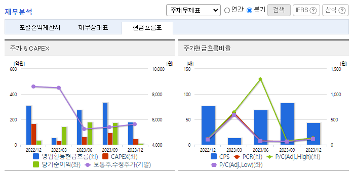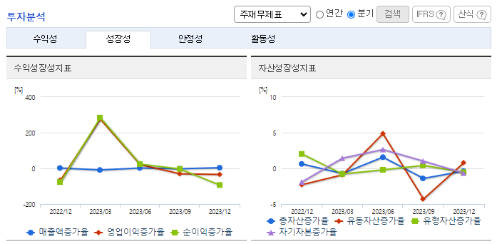 -2023년 12월 전년동기 대비 연결기준 매출액은 4.6% 감소, 영업이익은 15% 증가, 당기순이익은 0.6% 증가. 고물가와 고금리 등에 따른 경기침체 및 수요 둔화로 인해 매출액이 전기 대비 4.59% 감소함. 원가 절감 및 생산성 향상을 통해 영업이익과 법인세차감전 순이익은 전년 대비 각각 15.04%, 8.88%씩 증가했고, 당기순이익은 소폭 감소함.