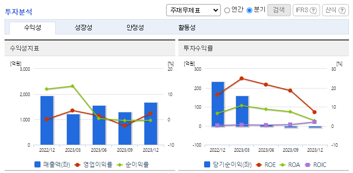 -2023년 12월 전년동기 대비 연결기준 매출액은 13.2% 감소, 영업이익은 65% 감소, 당기순이익은 52.5% 감소. 원자재 가격 급락으로 전체적인 태양광 밸류체인 가격이 하락세를 보이고는 있으나, 상대적으로 태양광 모듈의 가격은 큰 폭으로 감소하고 있지 않아 동사에게는 긍정적인 상황임. 정부의 신재생 에너지 예산 확보가 확실시되지 않고 태양광 산업의 수요 또한 감소하여 동사의 영업이익에 부정적인 영향을 미치고 있음.