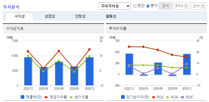 -2023년 12월 전년동기 대비 연결기준 매출액은 4.4% 감소, 영업이익은 19.4% 감소, 당기순이익은 29.5% 감소. 매출액이 소폭 감소했고, 동시에 판매비와 관리비, 그리고 인건비가 증가하면서 영업이익이 20% 가까이 감소함. 동사는 현재의 Agent영업방식에서 벗어나 신규 Buyer와의 Direct 영업을 통해 수익성을 개선함으로써 활발한 영업을 전개해 나가고자 함.