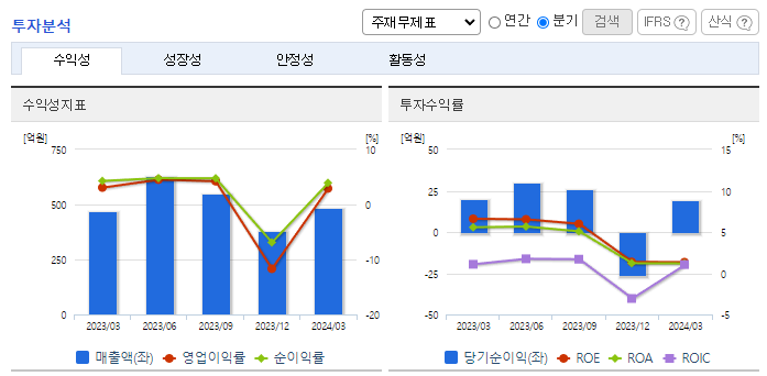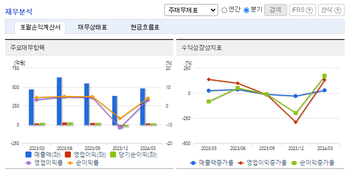 -2023년 12월 전년동기 대비 연결기준 매출액은 0.7% 증가, 영업이익은 67.4% 감소, 당기순이익은 78.7% 감소. 동사는 매출이 전년 실적을 돌파하며 선방했으나 원가상승의 여파는 피해 갈 수 없어 이익률 하락을 가져와 영업이익이 급격히 하락함. 동사는 고도화된 CRM시스템을 구축하였고, 새로운 고객관리 및 효율적인 업무프로세스를 사용하여 비즈니스 전략을 수립할 계획임.