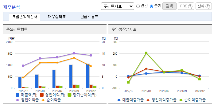 -2023년 12월 전년동기 대비 연결기준 매출액은 107.5% 증가, 영업이익은 235.8% 증가, 당기순이익은 240.7% 증가. 동사는 E-Commerce를 통해 K-Beauty 벤처브랜드 제품의 글로벌 유통을 중심으로, 물류 관리, 마케팅 관리 등 제품의 기획과 생산 이후 전반적인 사업을 대리하여 진행함. 동사는 자사 플랫폼과 국내 물류 센터 외에도 미국, 인도네시아 등 해외 현지 물류센터를 보유하고 운영하고 있음.