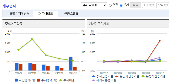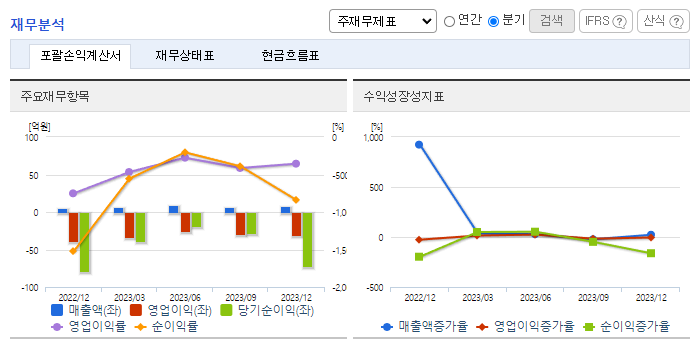 -2023년 9월 전년동기 대비 연결기준 매출액은 847.8% 증가, 영업손실은 14.5% 증가, 당기순손실은 21.7% 감소. 동사는 바이오 서비스와 연계되는 Liquid Biopsy를 위한 자동화 시스템 및 다양한 키트를 개발하고, 이에 대한 사업화도 진행 중임. CTC 기반 Liquid Biopsy 기술이 확대되면서 새로운 암진단 및 암케어를 위한 실수요자가 많이 발생될 것으로 예상되어 발전 가능성 높음.