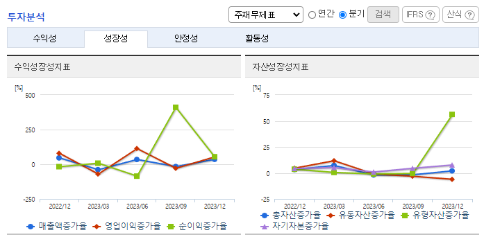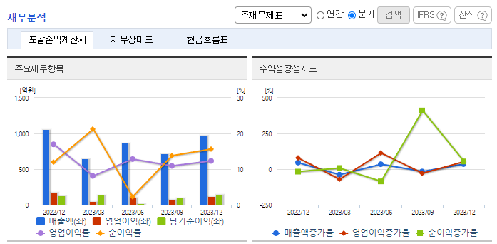 -2023년 9월 전년동기 대비 연결기준 매출액은 28.9% 증가, 영업이익은 129.4% 증가, 당기순이익은 49.5% 증가. 중계기 수출 호조(북미, 유럽, 일본 등)가 매출액 성장을 견인했고 원가율은 일부 상승했으나 판관비 등 비용 통제로 영업손익과 순손익 모두 크게 개선됨. 국방사업에서 종속회사인 ㈜쏠리드윈텍은 TICN(전술정보통신체계), '차기 군 위성통신' 등의 영역에서 사업규모를 확장하고 있음.