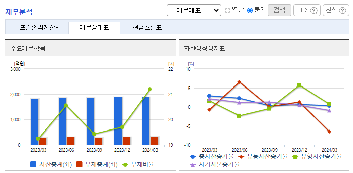 -2024년 3월 전년동기 대비 연결기준 매출액은 23.9% 감소, 영업이익 적자전환, 당기순이익 적자전환. 화장품 사업 부문이 21.60%, 이커머스 사업 부문이 27.12% 감소하면서 전체 외형 성장에 악영향을 줌. 화장품 매출에서 국내와 아시아 매출은 89.05%, 51.46% 증가했지만, 가장 비중이 높은 북미 매출이 35.75% 감소하면서 부정적인 영향을 줌.