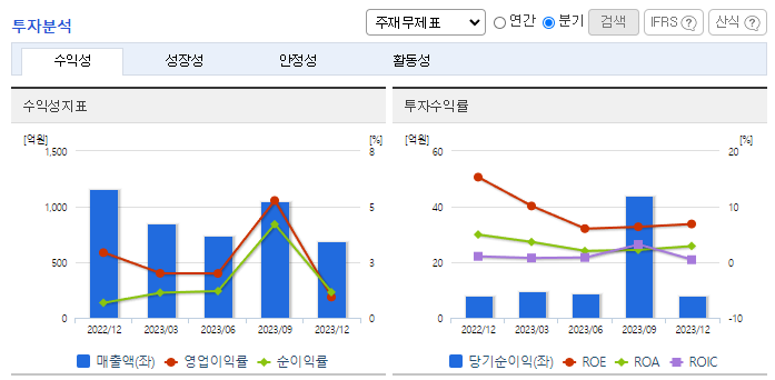 -2023년 12월 전년동기 대비 연결기준 매출액은 30.5% 감소, 영업이익은 54.6% 감소, 당기순이익은 49.2% 감소. 주력인 오디오 수출이 저조한 성적을 보이며 매출이 크게 감소함. 판관비와 인건비 등 비용 절감 노력에도 불구 영업이익이 대폭 축소. 현재 Digital 융합기술을 접목한 다양한 신제품 출시를 늘리고 ODM, EMS 사업분야를 지속 확대하는 중