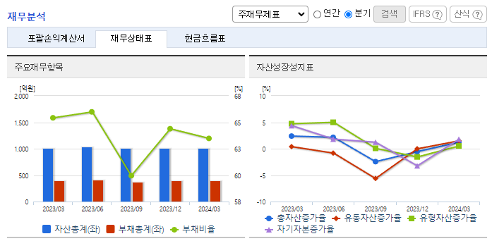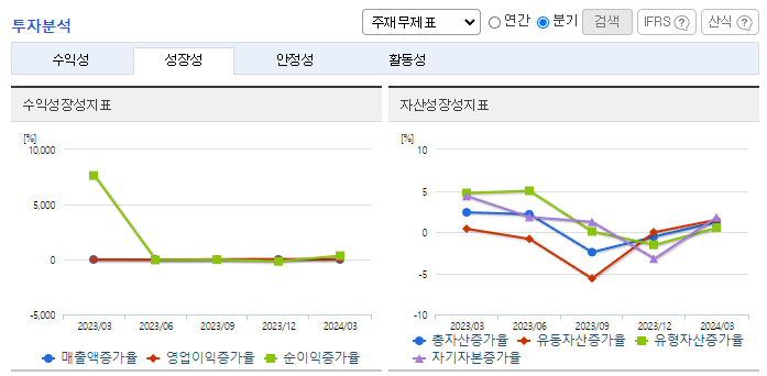-2024년 3월 전년동기 대비 연결기준 매출액은 7% 증가, 영업이익은 24.3% 증가, 당기순이익은 16.3% 감소. 이형지 필름 매출이 7억 가량 하락 했으나, 무이형지 필름이 3억 가량 성장, 썬루프 원단이 10억 가량 성장 하면서 매출이 소폭 상승함. 글리터 시트, 무수염색사 등 새로운 제품에서의 매출 기대. 향후 베트남, 인도네시아 공장 가동률이 상향될 예정.