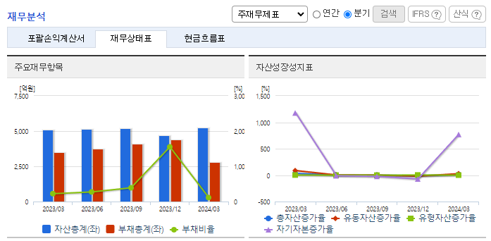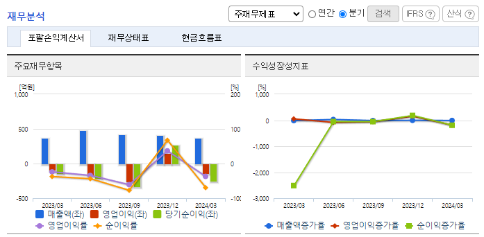 -2024년 3월 전년동기 대비 연결기준 매출액은 2% 감소, 영업손실은 51.5% 증가, 당기순손실은 82.5% 증가. 생산설비의 기계장치, 구축물, 비품 등의 매출원가 증가로 인한 영업이익 감소를 보이고 있음. 코로나19 및 보잉 운항정지로 인하여 매출액이 감소하였지만, 보잉의 운항 재개와 코로나19 백신의 보급으로 민항기 시장은 빠른 속도로 회복하고 있는 추세에 있음.