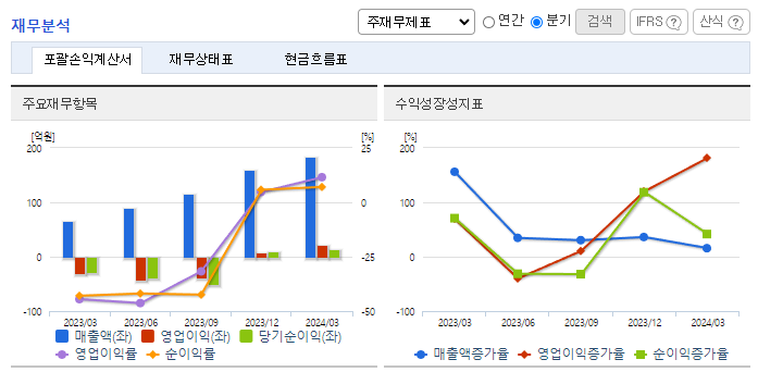 -2024년 3월 전년동기 대비 연결기준 매출액은 176.6% 증가, 영업이익 흑자전환, 당기순이익 흑자전환. 메인일렉콤 폴리우레탄 사업부인수에 따라 폴리우레탄 매출이 발생하였으며, MFA 및 테이프/필름 매출이 큰 폭으로 증가하며 영업이익 및 당기순이익 흑자전환함. MFA와 가스켓 등 기존 사업 아이템이 신규 출시될 모델에 양산 적용되어 공급물량이 대폭 증가함.