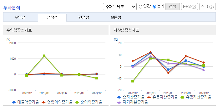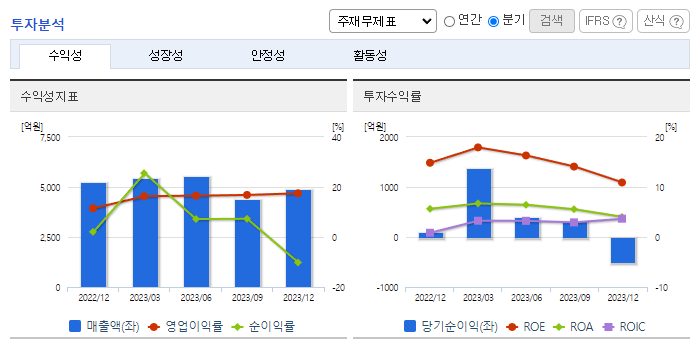 -2023년 9월 전년동기 대비 연결기준 매출액은 12.4% 감소, 영업이익은 10.6% 감소, 당기순이익은 8.8% 증가. 콘크리트부문의 2023년 당분기 생산실적은 제조금액을 기준으로 100,543백만 원이며 전년 동기대비 13.89% 감소하였음. 불황인 건설업 상황에서도 동사는 환경사업(폐배터리)에 집중하여 매출 다각화롤 꾀했고 이는 당기순이익 증가로 이어짐.