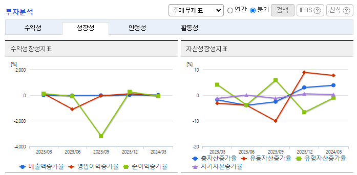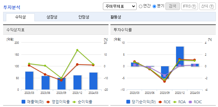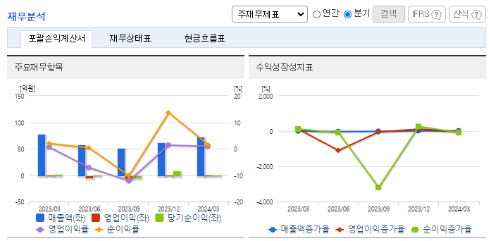 -2024년 3월 전년동기 대비 별도기준 매출액은 5.7% 감소, 영업이익은 57.1% 증가, 당기순이익은 29.9% 감소. 전년동기 대비 매출이 감소하였으나, 전분기 대비 매출이 19% 회복하였음. 반도체 관련 경기가 회복되면서 실적이 호전되고 있음. 이차전지 분야/로봇 OEM 생산 관련 매출등 신규 전방산업분야의 매출도 발생하고 있음. 스마트 헬스 사업등 신규사업 분야의 시장성 사업성 강화를 위한 개발활동도 수행 중임.