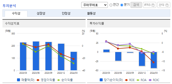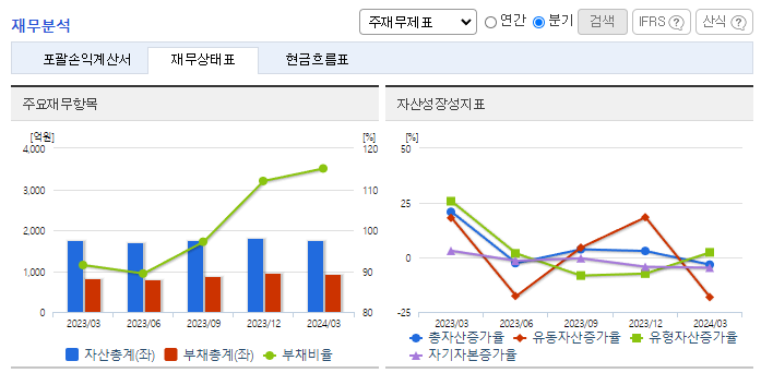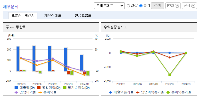 -2024년 3월 전년동기 대비 연결기준 매출액은 33.3% 감소, 영업이익 적자전환, 당기순이익 적자전환. 전년 동기 대비 제작 대행 매출이 크게 감소하였음. 특히 내수 수요가 감소한 결과로 보임. 비용도 증가하여 영업이익 적자 전환에 영향을 미침. K-POP 한류 콘텐츠 제작 전문회사로서, 주로 K-POP 아티스트 인큐베이팅 시스템을 기반으로 파생되는 여러 분야를 개발하여 서비스해 나가고 있음.