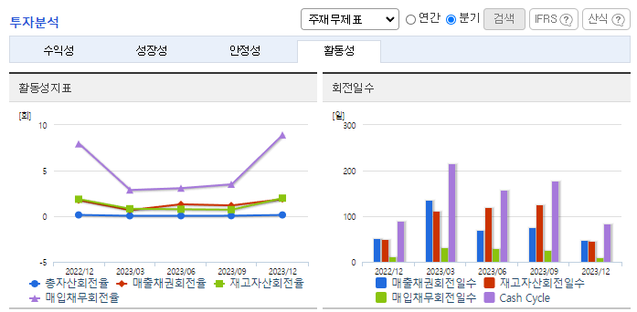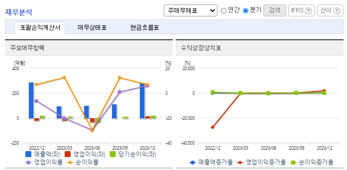 -2023년 9월 전년동기 대비 별도기준 매출액은 15.4% 감소, 영업이익은 1142.9% 증가, 당기순이익은 387.3% 증가. 2023년 6월 대비 수출실적이 38.7% 감소한 4,384백만 원을 기록하며 매출액 감소에 큰 영향을 끼침. 디지털전환이 가속화됨에 따라 수요감소에 영향을 미치고 있으나, 주요 고객층인 기업과 도소매, 웹사이트, 해외수출과 같이 수익창출의 영역을 확대하여 대응 중임.