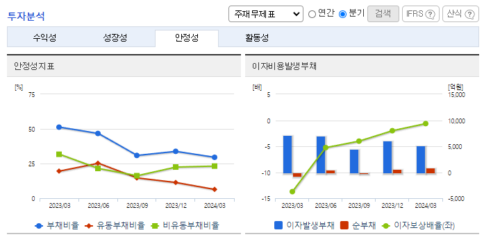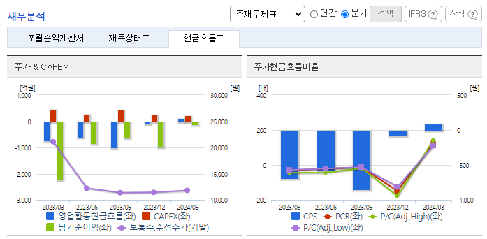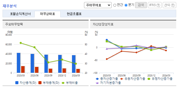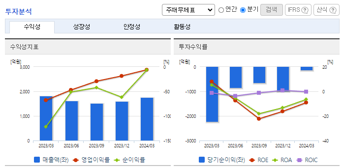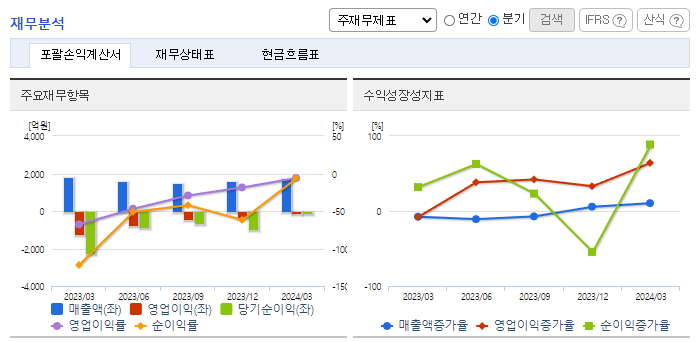 -2024년 3월 전년동기 대비 연결기준 매출액은 3.3% 감소, 영업손실은 91.5% 감소, 당기순손실은 95% 감소. 체외진단 관련 다양한 포트폴리오를 보유하고 있으며, 체외진단 시장의 70%를 커버하는 진단 플랫폼을 구축함. 무형자산강각비 등 회계적 비용이 발생하였으나, 현금유 출이 없는 회계적 비용으로 당기부터 비경상적 회계손익이 상당 부분 개선될 것으로 기대됨.