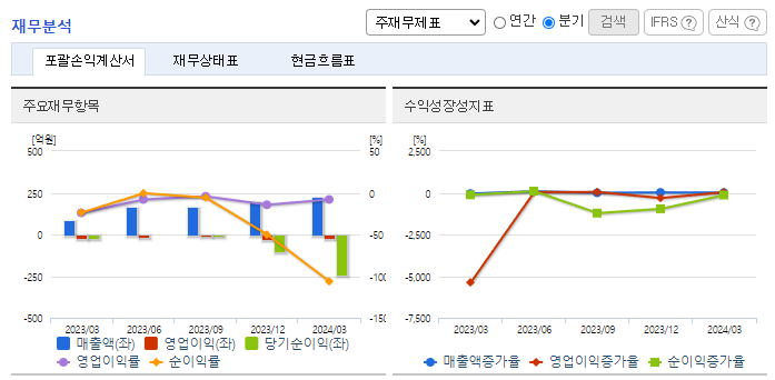 -2024년 3월 전년동기 대비 연결기준 매출액은 152.4% 증가, 영업손실은 16.1% 감소, 당기순손실은 1073.9% 증가. 동사는 유통사업에 현재 삼성과 애플사로 양분화되어 있는 스마트폰 시장에서 틈새시장을 노려 사업을 진행하며 매출 증대를 위해 향후 스마트폰 판매관련 하여 타기업과 전략적 제휴를 준비 중에 있음. 동사는 샤오미 코리아의 공식 파트너사로 스마트폰 부문은 인도, 동남아시아 시장에서 큰 인기를 얻고 있음.