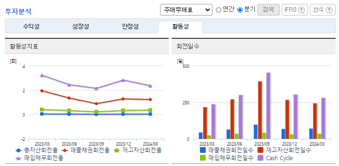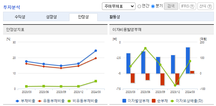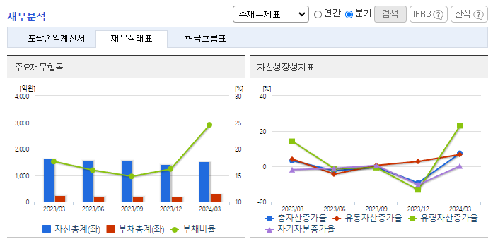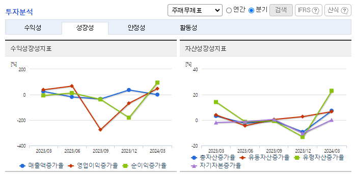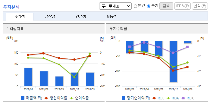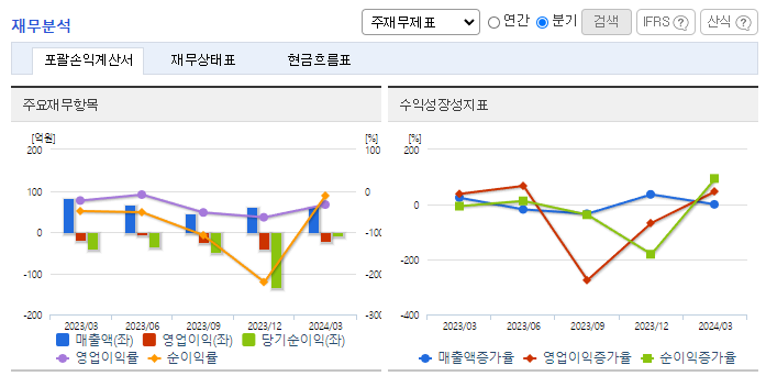 -2024년 3월 전년동기 대비 연결기준 매출액은 25.1% 감소, 영업손실은 5.9% 증가, 당기순손실은 82% 감소. 매출 비중의 81%가량을 차지하는 머시닝센터 매출이 감소하며 외형이 축소됨. 바이오사업이 연구개발 단계에 있어 매출에 기여하지 못함. 추후 Abpro Corporation사와 이중항체 항암신약 개발과 아시아 지역 독점적 판권 부여받아 총 48개국 바이오 시장에 진출하여 사업을 영위할 예정임.