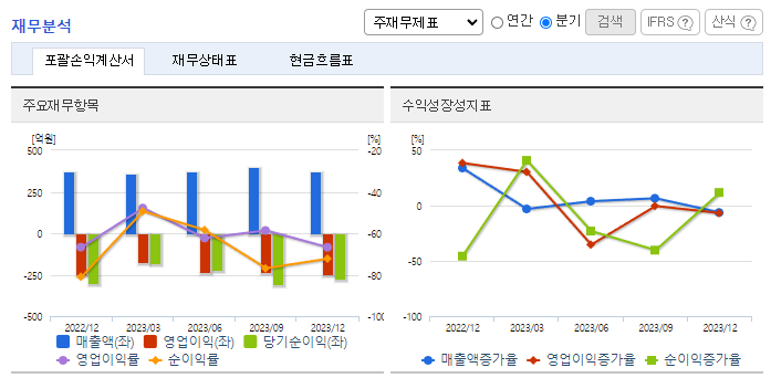 -2023년 9월 전년동기 대비 연결기준 매출액은 174.3% 증가, 영업손실은 32.5% 감소, 당기순손실은 2.3% 감소. 동사의 금속표면경화육성 (Hardfacing) 사업부문은 꾸준한 매출 시현을 보이며 확고한 현금 창출 사업부문으로 거듭남. 바이오시밀러 개발을 시작하여 세계 최고 수준의 개발 기술을 확보하였으며, 이에 따라 개발된 주요 제품은 세계시장에 승인 및 유통을 앞두고 있음.