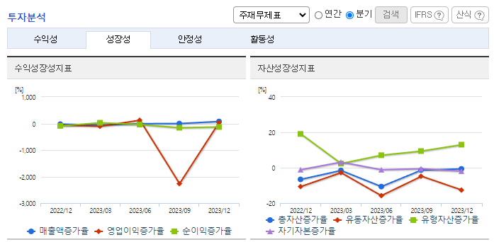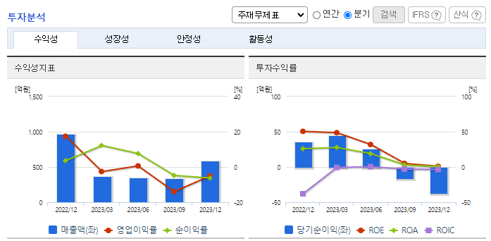 -2023년 9월 전년동기 대비 연결기준 매출액은 61% 감소, 영업이익 적자전환, 당기순이익은 91.4% 감소. 매출 감소에 따른 매출원가와 판관비가 47.9%, 7.4% 감소하며 비용 부담은 줄었지만 매출 감소폭이 커 영업이익 역시 대폭 감소함. 영업이익 적자전환에도 불구하고 이자수익이 1,110.5% 증가 등 각종 영업 외 부문 수익의 영향으로 당기순이익은 흑자 유지됐으며 흑자 규모는 대폭 감소함.