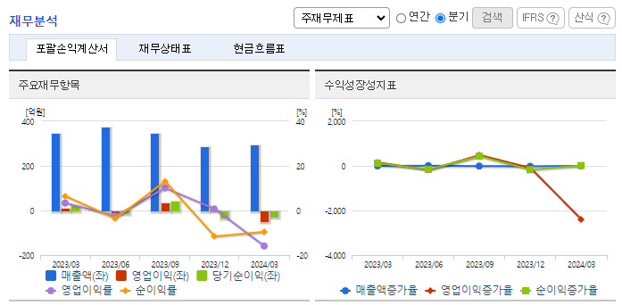 -2024년 3월 전년동기 대비 연결기준 매출액은 14.9% 감소, 영업이익 적자전환, 당기순이익 적자전환. 동사는 KAIST와 차세대 ESS 연구센터 설립을 위한 연구계약을 체결했고, 에너지저장장치의 원천기술 및 응용기술을 확보할 수 있는 중요한 첫발을 내딛고 이를 수행하기 위한 발 빠른 행보를 이어갈 전망임. 전기공급 및 제어장치 제조판매업, 전력저장용 관련 제품의 제조업 등 신사업을 구체화하기 위해 사업 목적을 추가하였음.
