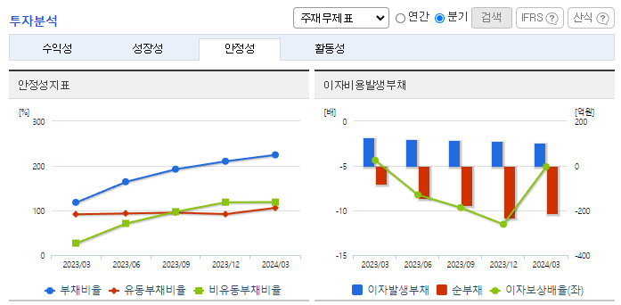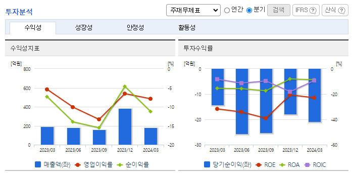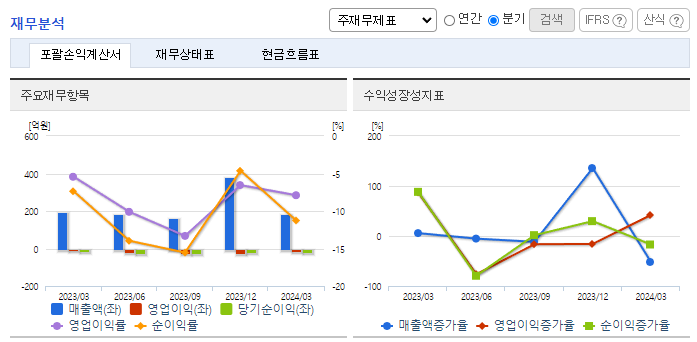 -2024년 3월 전년동기 대비 연결기준 매출액은 5% 감소, 영업손실은 37.9% 증가, 당기순손실은 45.1% 증가. 오디션 프로그램 'THE IDOL BAND'를 제작하여 '하이파이유니콘'을 2023년 6월 데뷔시켰으며 11월에 보이댄스그룹 '앰퍼샌드원'을 데뷔시키며, 신인 발굴 및 육성에 주력하고 있음. 2024년은 기존 아티스트들의 활동 확대 및 신인아티스트들의 성장을 견인하여 주요 사업인 엔터테인먼트 사업에 집중할 예정.