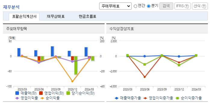 -2023년 12월 전년동기 대비 별도기준 매출액은 38.7% 감소, 영업이익 적자전환, 당기순손실은 89.2% 증가. 기업의 사업 방향을 재조정을 위해 2023년 간편 모바일 결제 플랫폼 서비스 중단 및 종속회사 비오디에스링크의 지분을 매각함. 신규사옥 취득으로 인한 당기비용 발생 및 B2C 사업영역으로의 확장을 위하여 광고선전비 및 인재영입으로 비용이 증가하며 영업이익 적자 전환함.