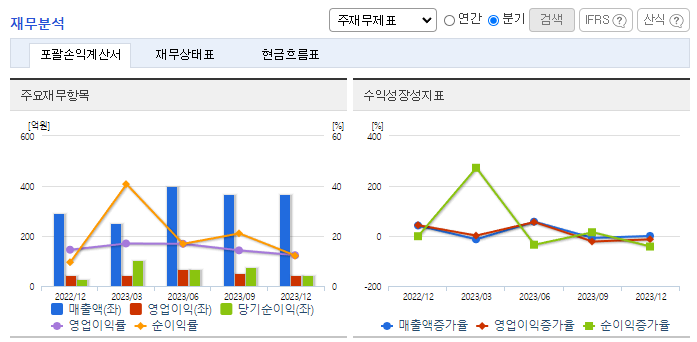 -2023년 12월 전년동기 대비 별도기준 매출액은 55.7% 증가, 영업이익은 73.9% 증가, 당기순이익은 88.4% 증가. 유체기계사업부 제품은 수출, 상품은 내수시장에서 호조를 보이며 전체 외형이 크게 성장함. 적극적인 원가 및 판매관리비 절감 노력으로 영업이익도 대폭 증가. 동사는 화학플랜트가 늘어날수록 수혜를 입으며, 황산니켈, 음극재, 양극재, 동박 등 배터리 소재 공장의 신증설이 늘어나는 것도 동사에 호재로 작용