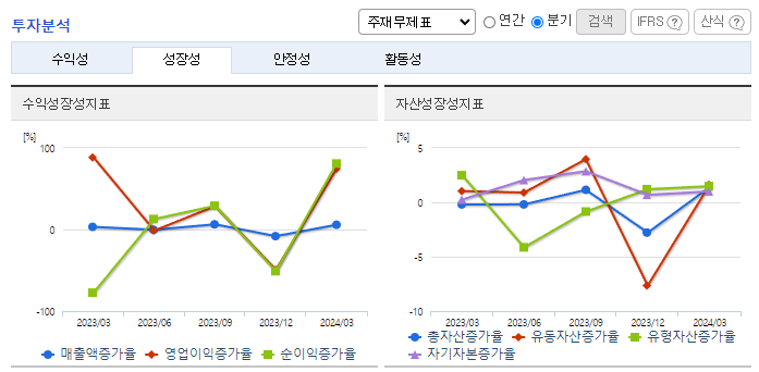 -2024년 3월 전년동기 대비 연결기준 매출액은 3.1% 증가, 영업이익은 12% 증가, 당기순이익은 18% 증가. 일본을 포함한 다른 외국으로의 수출을 확대하고 중국인 기호에 맞는 다양한 완제품을 생산하여 14억 인구의 중국 내수 시장으로의 진출을 적극적으로 모색. 동사 한국 내 당면시장 점유율은 업계 1위를 차지하고 있음에도 상품으로 판매하던 일부 품목을 직접 제조 및 판매하여 매출성장을 이루고 있음.